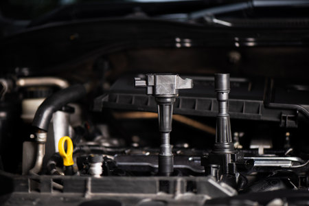 Mechanical man hand checking and change ignition coil with spark plug of car engine transport industry