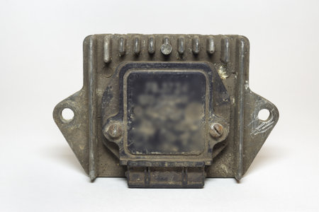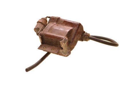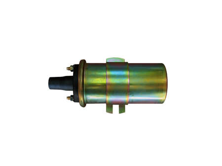 Old Ignition coil of Gasoline engine white background service concept and maintenance long time with car
