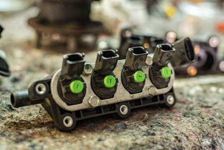 Car ignition coil on a white background close-up. Ignition coil for gasoline four-cylinder internal combustion engine