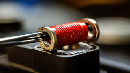 Detailed close-up of a red coil spring on a mechanical component, showcasing precision and craftsmanship with a blurred workshop backdrop emphasizing the industrial environment.