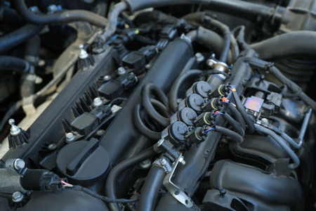 NEW Car engine part. Modern powerful car engine. The powerful engine of a car.Detail photo of a clean car engine