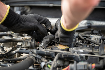 Mechanic wearing gloves fixing engine wiring inside car during repair