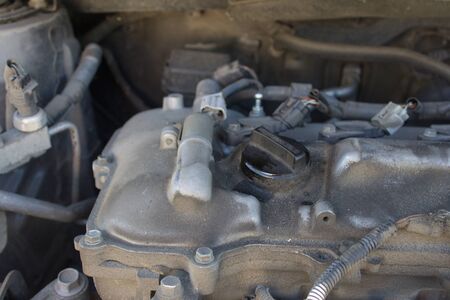 Disassembled car dirty engine close-up to engine parts and cylinder head at car garage