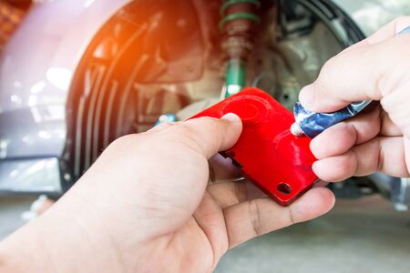 Close up hand a man apply grease on new brake pad of car for Lubricate and reduce noise in service car process