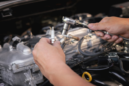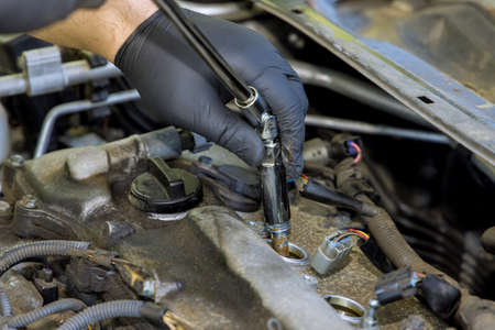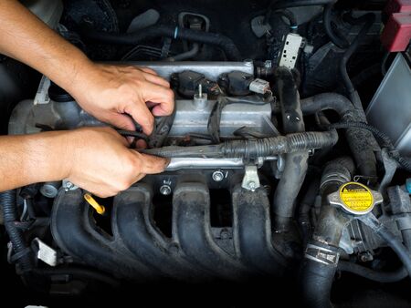Technician check and change Ignition coil of Gasoline engine in engine room service concept and maintenance long time with car