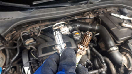 Spark plug replacement. Close up old spark plug, car maintenance concept.