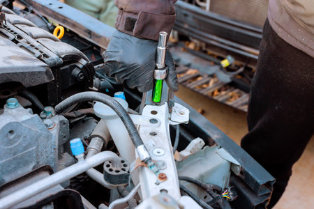 Socket wrench with used spark plug in car engine bay. Mechanic repair or vehicle maintenance concept.