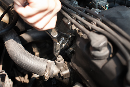 Someone is fixing vehicle using wrench other tools in garage during auto car service