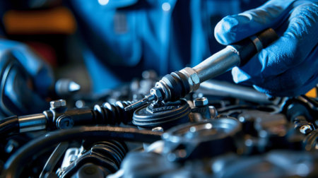 Close-up of a mechanic's hand in blue gloves using a screwdriver on a car engine. the scene highlights technical expertise and precision in automotive repair within a workshop setting. Generative AI