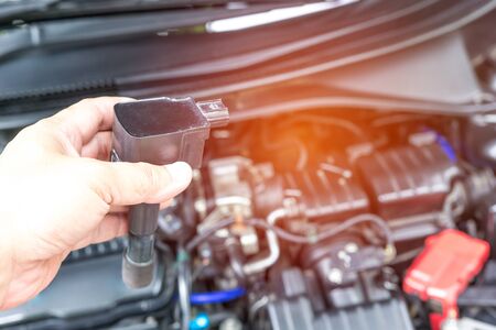 Hand a man check and change Ignition coil of Gasoline engine in engine room service concept and maintenance long time with car