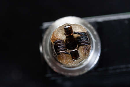 close up, macro shot, top view of single micro coil with japanese organic cotton wick in high end rebuildable dripping atomizer for flavour chaser isolated on black background, vape gear
