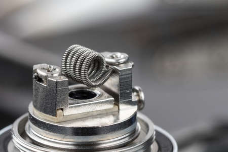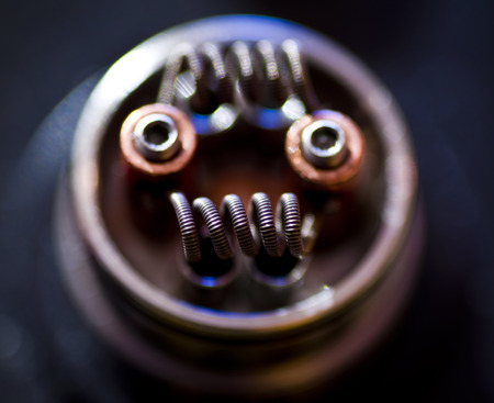 close up, macro shot, top view of single micro coil in high end rebuildable dripping atomizer for flavour chaser, vape gear, selective focus