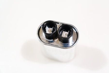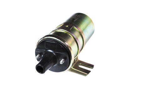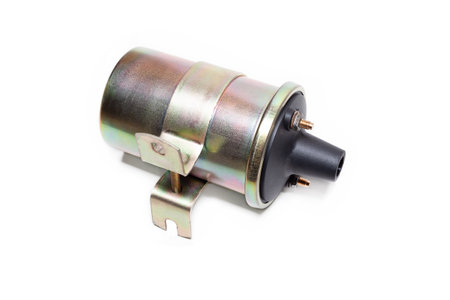 Black ignition coil for engine, isolated on white background. Spare parts for vehicle repair in garage.