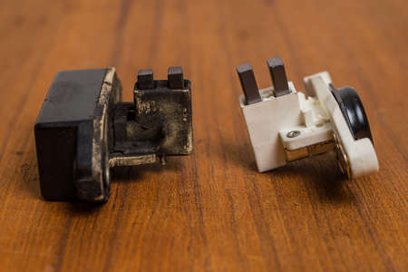 Comparison of old and new alternator brushes and regulator on a wooden work bench. Spare parts comparison for alternator service.
