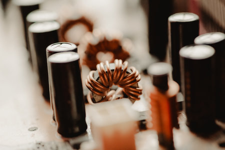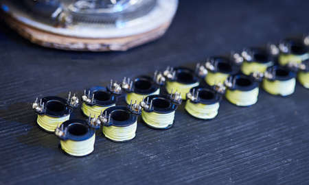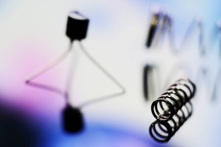 Iron spirals and a transistor in blur. Shiny metal springs in blur.