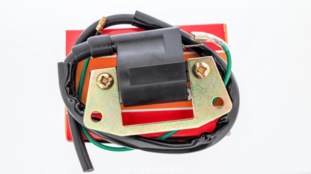 Close-up of a new ignition coil and attached spark plug cap for a small two-stroke engine (eg, chainsaw or trimmer) isolated on a clean white background. Essential replacement part.