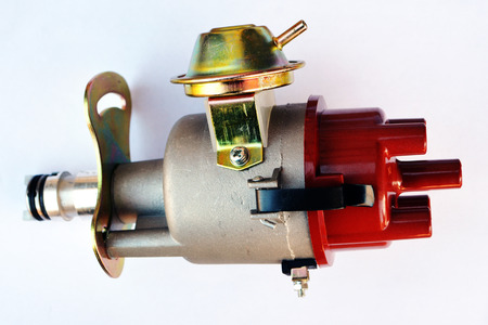 Car ignition coil on a white background close-up. Ignition coil for gasoline four-cylinder internal combustion engine