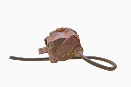 Old Ignition coil of Gasoline engine white background service concept and maintenance long time with car
