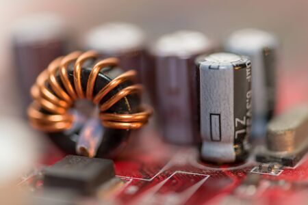 Electronic transformer with ferromagnetic core and coil copper wire on PCB. Closeup of red cylindric inductor soldered on green circuit board with tin on bottom side and blue background. Cable TV amp.