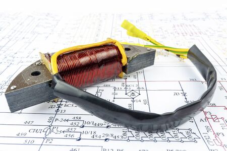 Electrical engineering. Old vintage relay with copper coil. Contacts of an old electrical relay.