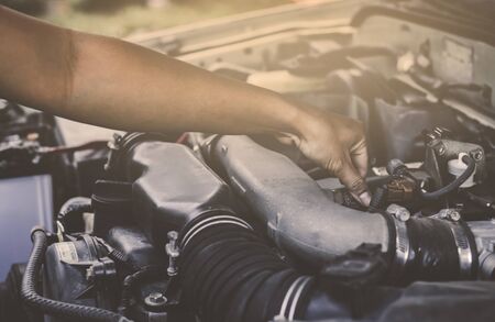 Hand a man check and change Ignition coil of Gasoline engine in engine room service concept and maintenance long time with car