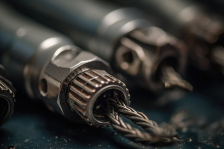 Macro shot of industrial connectors in a manufacturing plant with intricate details and metallic textures