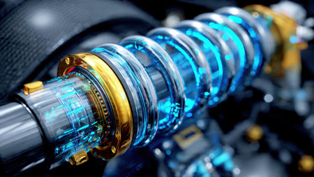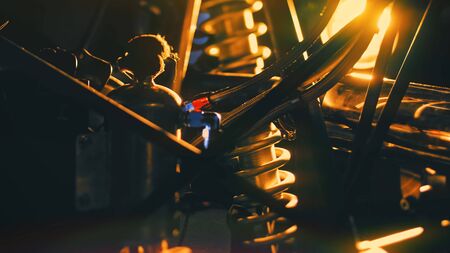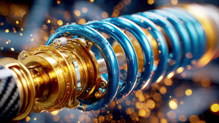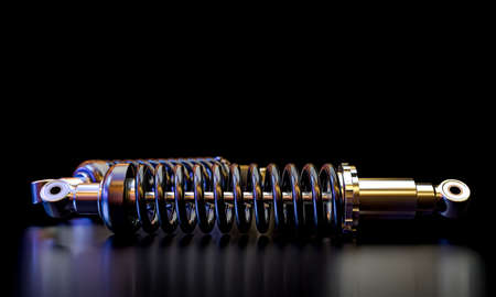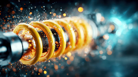 A detailed shot of a shock absorber on a motorcycle revealing the intricate inner workings that dampen vibrations