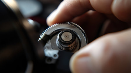 A closeup of a focus pullers hands adjusting the focus wheel showing the intricate mechanics of the camera while the blurred background hints at the dramatic scene unfolding just beyon