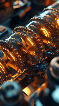 This striking close up captures the sleek detail of a metallic engine component bathed in warm light and precise detailing showcasing its complexity and construction.