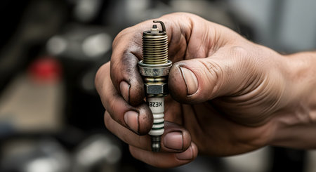 A close-up shot of a car mechanic's dirty, grease-stained hand holding an old, used spark plug. The background is a blurred auto repair shop. This image represents auto maintenance, car repair, and manual labor.