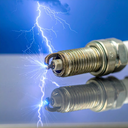 A powerful bolt of electrical energy, resembling lightning, arcs across the electrodes of a spark plug.