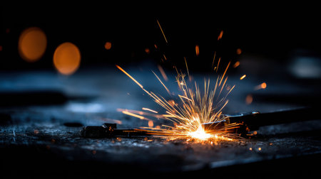 Captured moment of welding with intense sparks flying illustrates the artistry and energy of metal fabrication in a dimly lit workshop, showcasing craftsmanship and precision.