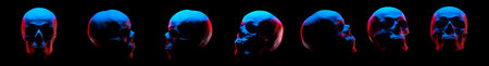 Model of the human skull with red eyes isolated on black background with clipping path. Concept of terror, physiology learning and drawing.