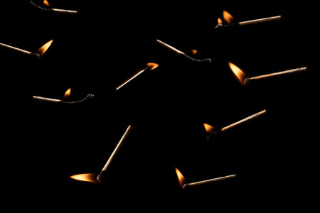 Line of burning matches on black background