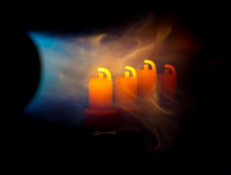 Spark plug with fire on dark background, close-up.