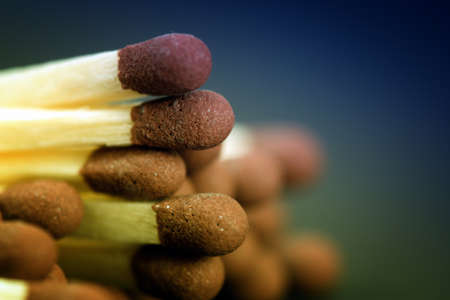 A row of matches with one lit match in the middle. Concept of a single match being able to ignite a whole row of matches