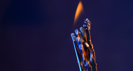 A striking close-up of a flaming matchstick amidst unlit matches on a dark surface. The image captures the beauty and danger of fire in a still life composition.