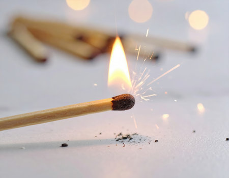 A close-up image of a matchstick igniting with a vibrant flame and sparkling effect on a white background. The match head glows, creating a mesmerizing detail.