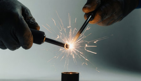 Two hands, covered in protective gloves, create bright sparks while welding metal pieces together in a dimly lit workshop. The atmosphere is filled with energy and creativity.