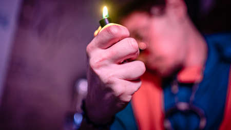 The flame of a small burning match in a womans hands. Woman protects the fire from the wind. Dusk, shooting outdoors. Blur, noise, defocus, grain effect.