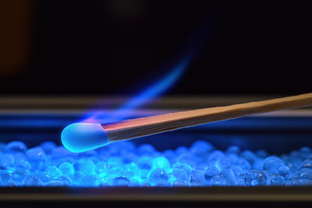A matchstick ignites, producing blue flames while resting on vibrant gel balls in a dark setting.