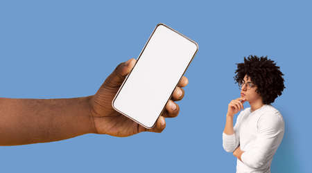 Pensive black guy looking at big white empty smartphone screen