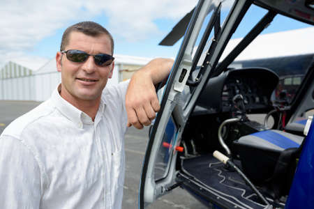 Portrait of helicopter pilot standing near vehicle in field airport.