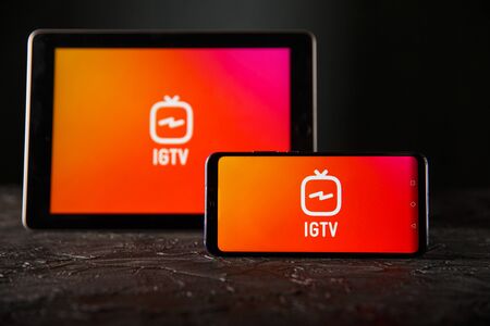 IGTV logo on the screen smartphone closeup. IGTV is a separate video application from Instagram for smartphones on Android and iOS. Moscow, Russia - December 12, 2019