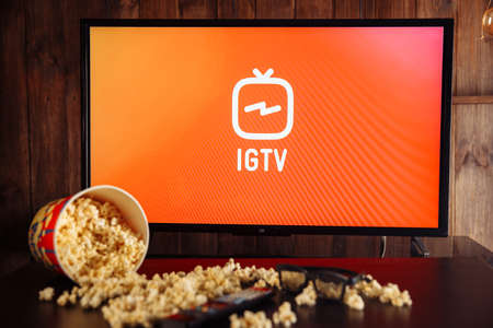 Tula, Russia, 04 May 2020: IGTV on the Tv screen and bowl of popcorn