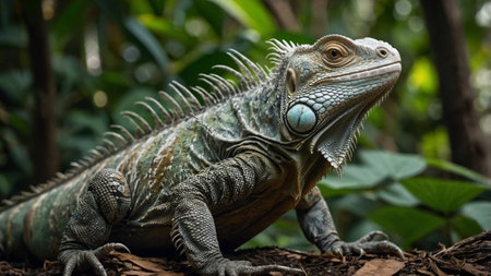 A closeup of a green iguana in an outdoor setting. AI-generated.