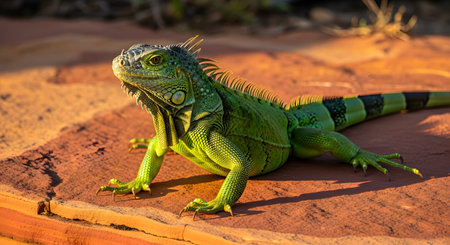 A green iguana basking in the sunlight on a rock, with its scaly skin and long tail, highlighting the reptile's natural habita
