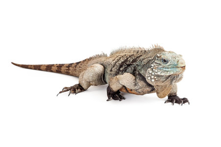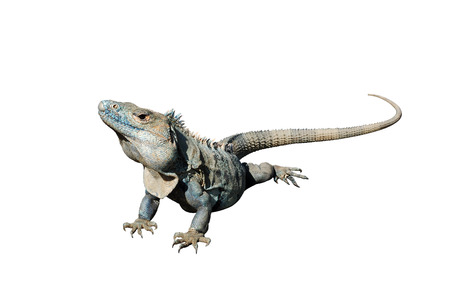Grand Cayman Blue Iguana, an endangered species of lizard commonly found in the dry forests and shores of Grand Cayman Island. Lizard is walking forward on a white background.