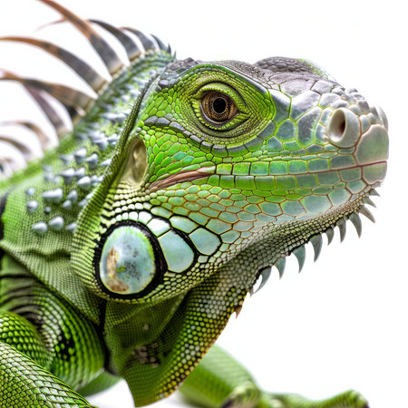 The mesmerizing close-up of a vibrant green iguana reveals its intricate scaled skin and captivating eye, a truly remarkable wild reptile