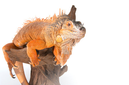 Close up of red iguana head with beautiful skin holding on the timber. Yellow albino iguana head isolated on black background